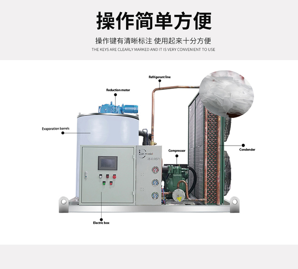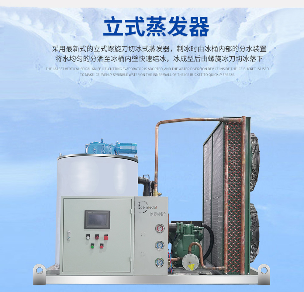 片冰機,制冰機的一種,片薄、干爽疏松狀的白色冰。平面形狀不規(guī)則,厚度15毫米 —22毫米,直徑約為12 - 45毫米。 片冰質(zhì)地干燥、柔軟無尖銳棱角,不會刺傷冷凍物體。冷藏包裝過程中其扁平的外型將盡可能避免傷害到被冷藏物,對被包裝食品起到保護作用。 片冰具有大接觸面積、快速制冷、儲藏運輸便捷、混合徹底,減少熱交換,保持冰的溫度,并有良好的保濕效果等特點。自動片冰機采用先進的立式螺旋刀切冰式蒸發(fā)器,制冰時由冰桶內(nèi)部的分水裝置將水均勻的分灑至 冰桶內(nèi)壁快速結(jié)冰,冰成型后由螺旋冰刀切冰落下。
